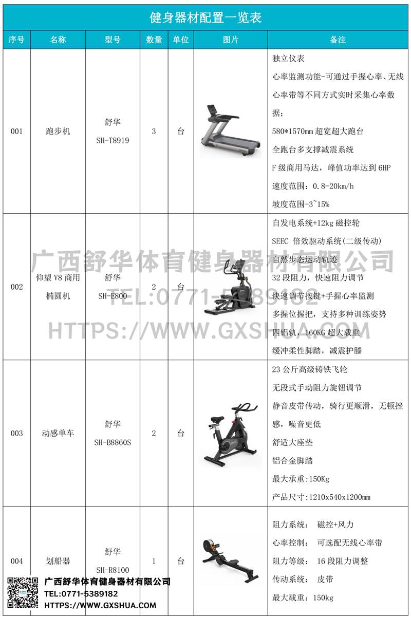 1.米兰V9跑步机SH-T8919*3台-580*1570mm超宽超大跑台-跑感舒适,跑台整体安全稳定;全跑台多支撑减震平台,保证跑台超强支撑力,达到180kg支撑,满足专业健身房需求。F级商用马达-超强马达,AC 3.0HP 交流,峰值功率达到6HP,F级商用品质。速度范围达到0.8-20km/h;V9跑步机可实现跑台扬升功能,坡度范围-3~15%,满足客户不同的锻炼需求。