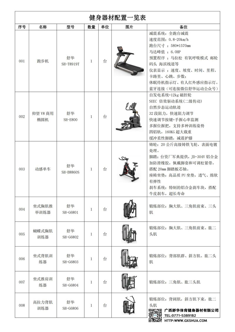 1.米兰V9+智能跑步机SH-T8919T*5台-V9+采用全跑台减震设计,为跑者提供舒适的落脚地感和稳定的跑步支撑,良好的缓冲防护,降低膝关节受伤风险。商用大跑台,为跑者提供从容奔跑空间,180kg承载力,580*1570纯跑台面积,满足专业健身需求。V9+采用F级商用马达,6HP峰值马力,20km/h最高速度,提供源源不断的动力。V9+内置健身直播软件,每周提供直播课程,内含大量专业线上健身点播课程,可为健身房不同人群提供多样化健身课程服务。V9+搭载全新跑步姿态分析系统,提供五大步态数据,为跑者提供综合评估及训练建议,帮助跑者调整优化跑姿,让运动更科学高效。3D竞赛软件,画面如同VR游戏效果,提供训练及竞赛模式,线上竞赛模式,可联动不同单位及公司,不同健身房之间健身爱好者,打造职工健身文化,促进交流。