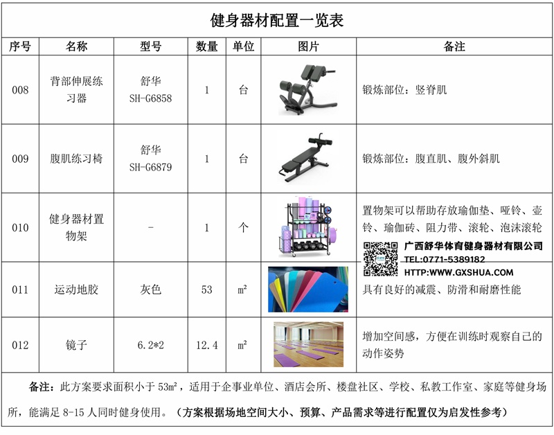 此方案要求面积小于53m²,适用于企事业单位、酒店会所、楼盘社区、学校、私教工作室、家庭等健身场所,能满足8-15人同时健身使用(方案根据场地空间大小、预算、产品需求等进行配置仅为启发性参考)