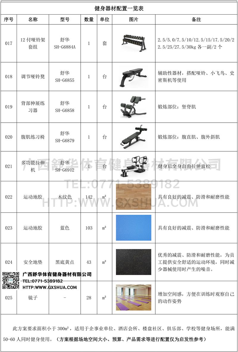 此方案要求面积小于300m²,适用于企事业单位、酒店会所、楼盘社区、俱乐部、学校等健身场所,能满50-60人同时健身使用。(方案根据场地空间大小、预算、产品需求等进行配置仅为启发性参考)