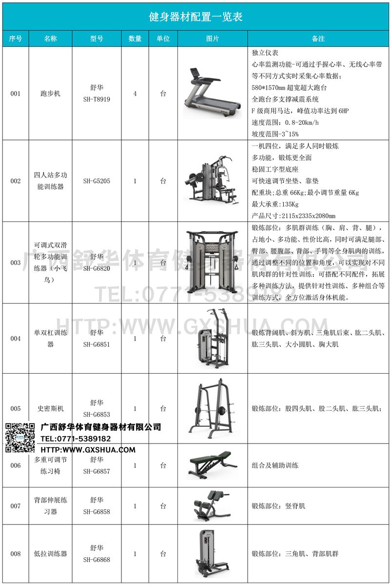 史密斯机(1台)、深蹲架1台)、水平推举椅1台)、多重可调节练习椅(1台)、腹肌训练器(1台)、罗马椅(1台)、上斜练习椅(1台)、10付哑铃套组(1套)、可调哑铃凳(1张)-可以实现对不同肌肉群的针对性训练,满足肌肉训练需求,全方位激活身体机能。